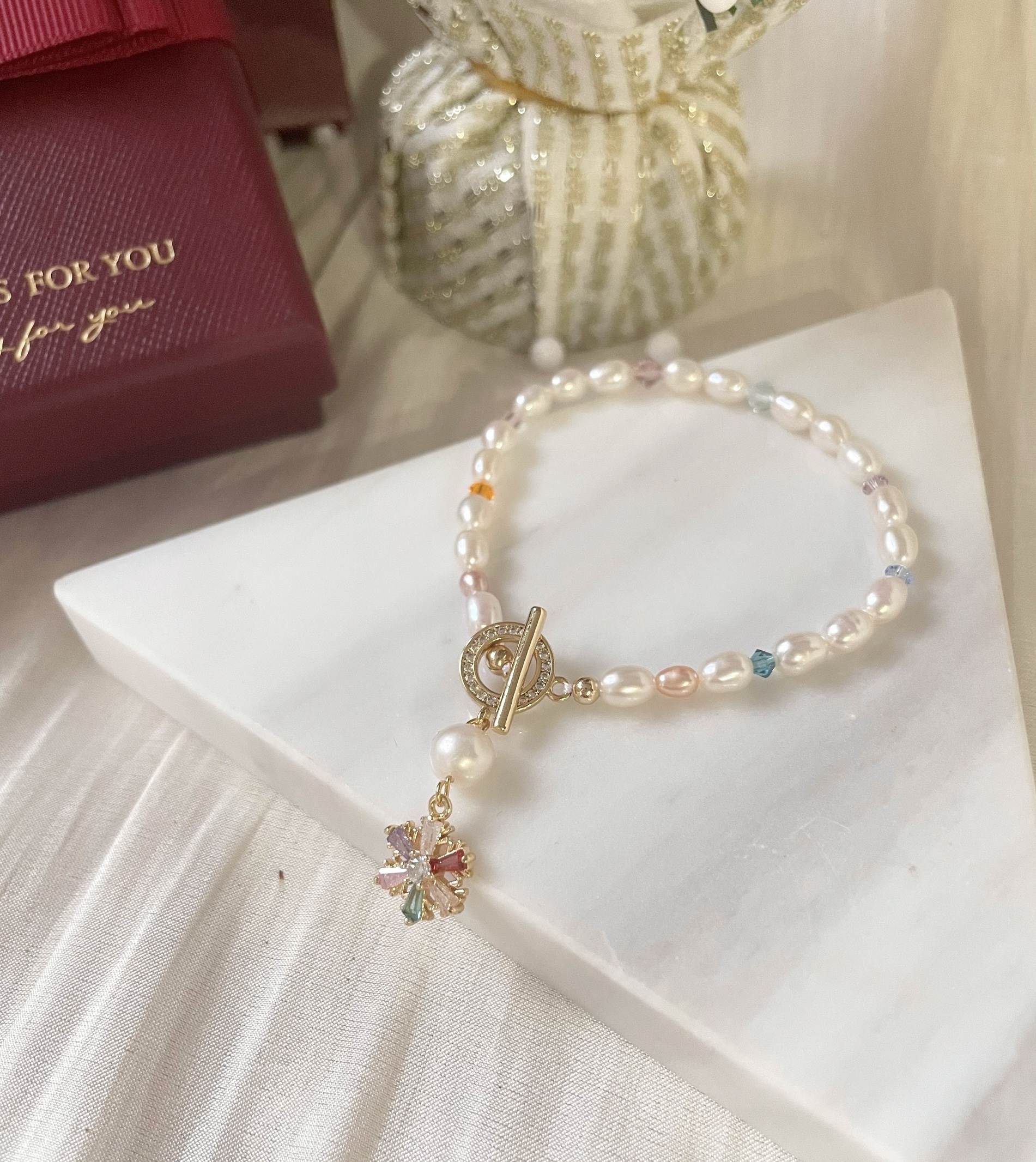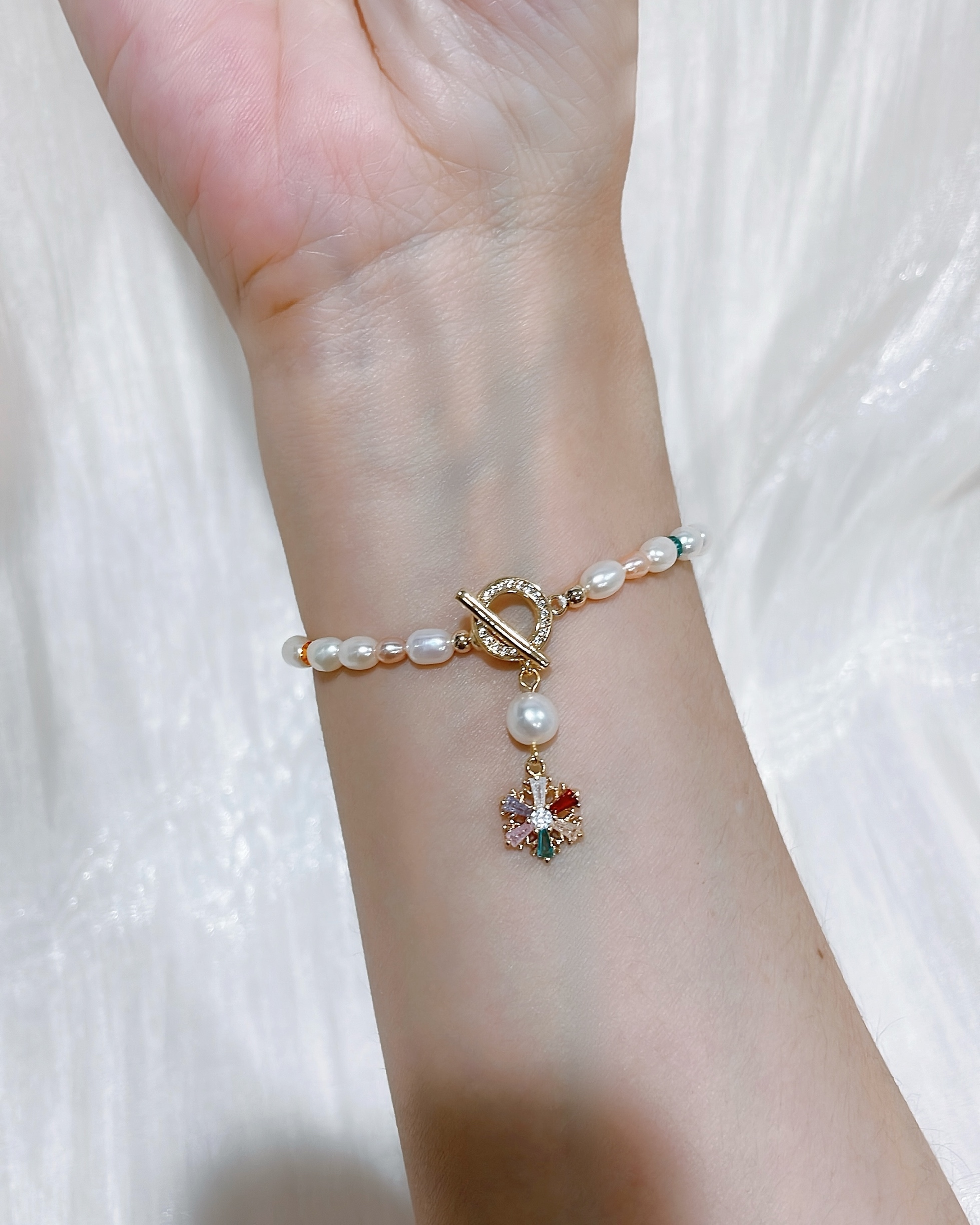 天然淡水米形珍珠點綴繽紛水晶及雪花吊飾,可可愛愛的聖誕氛圍~
