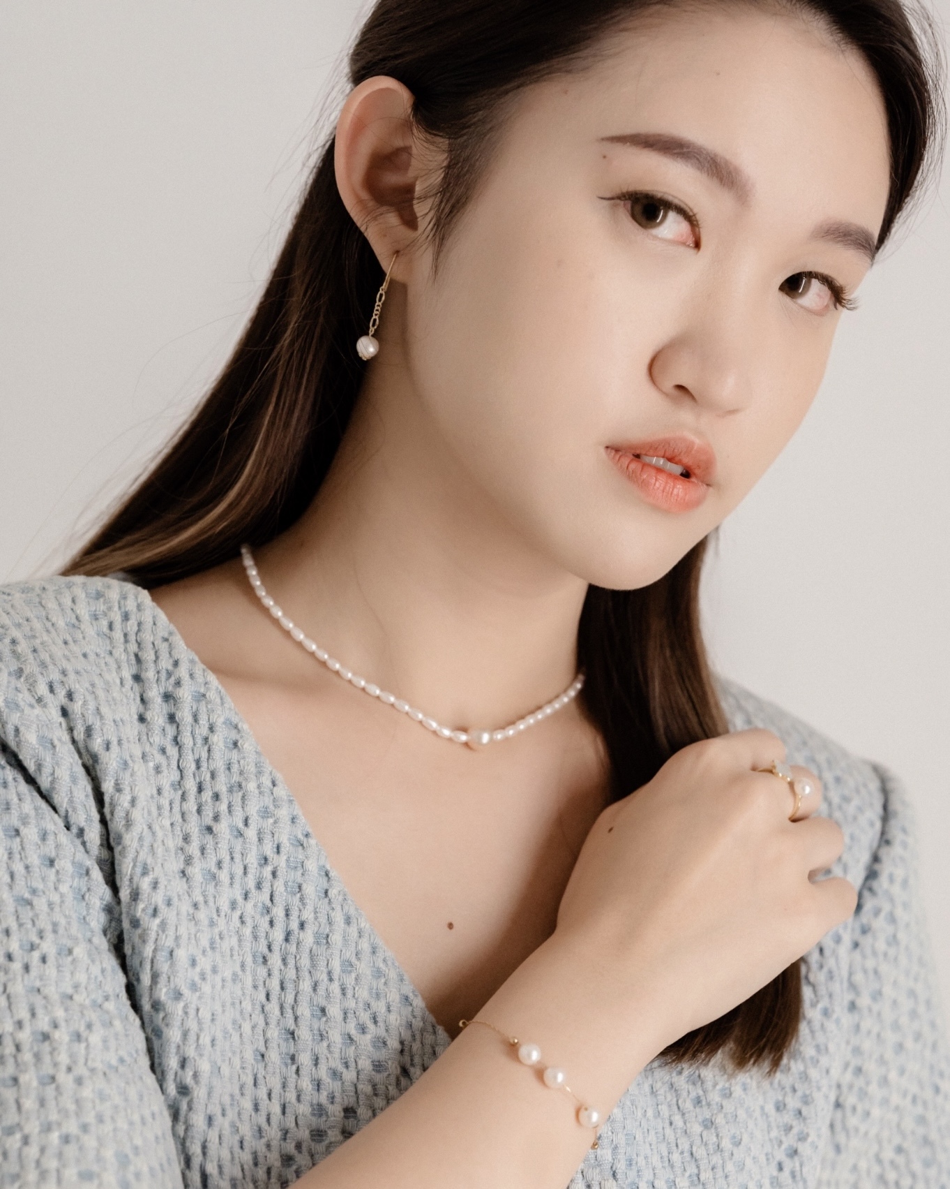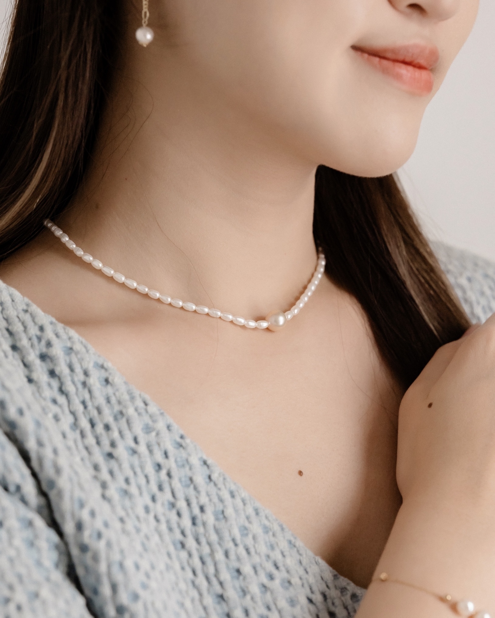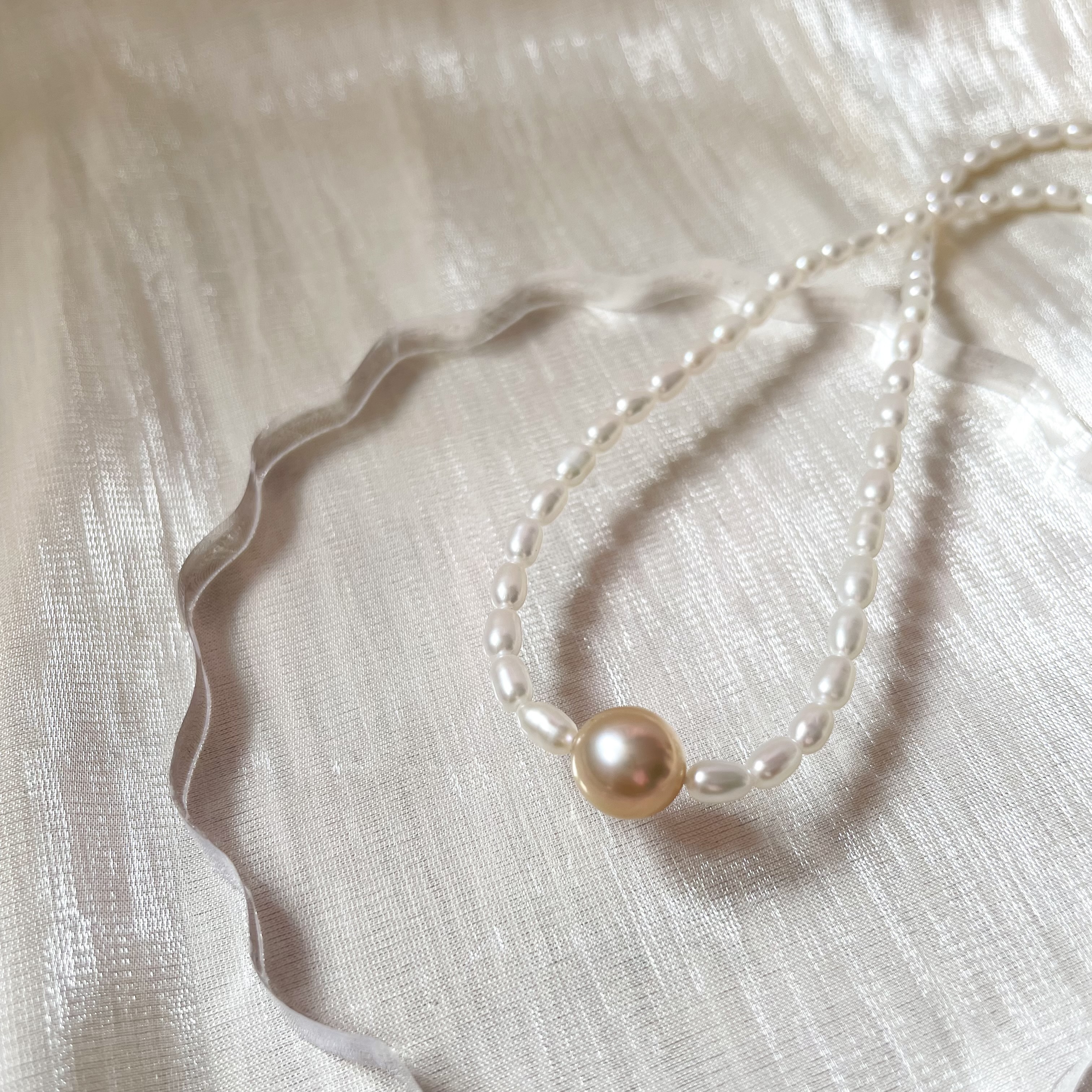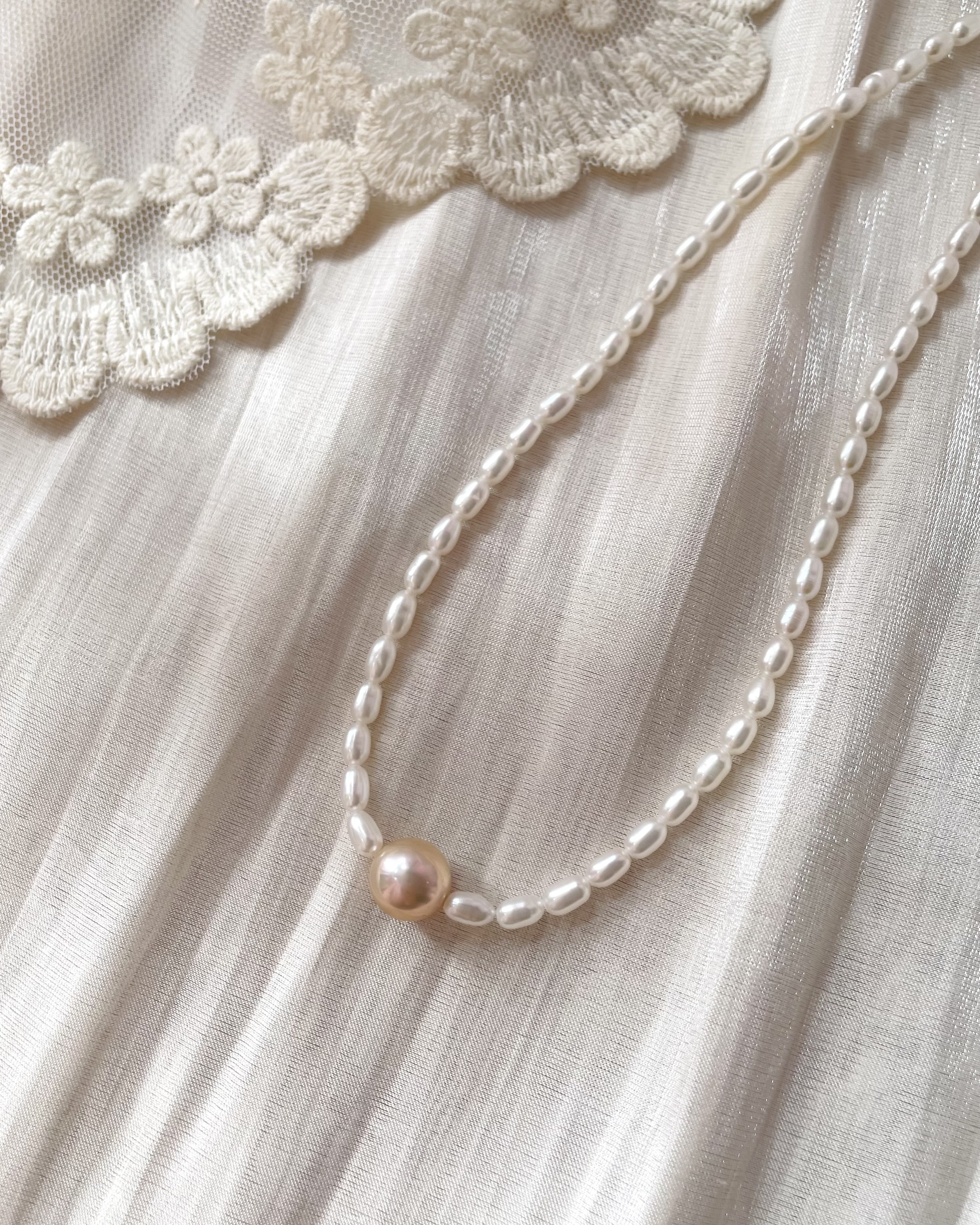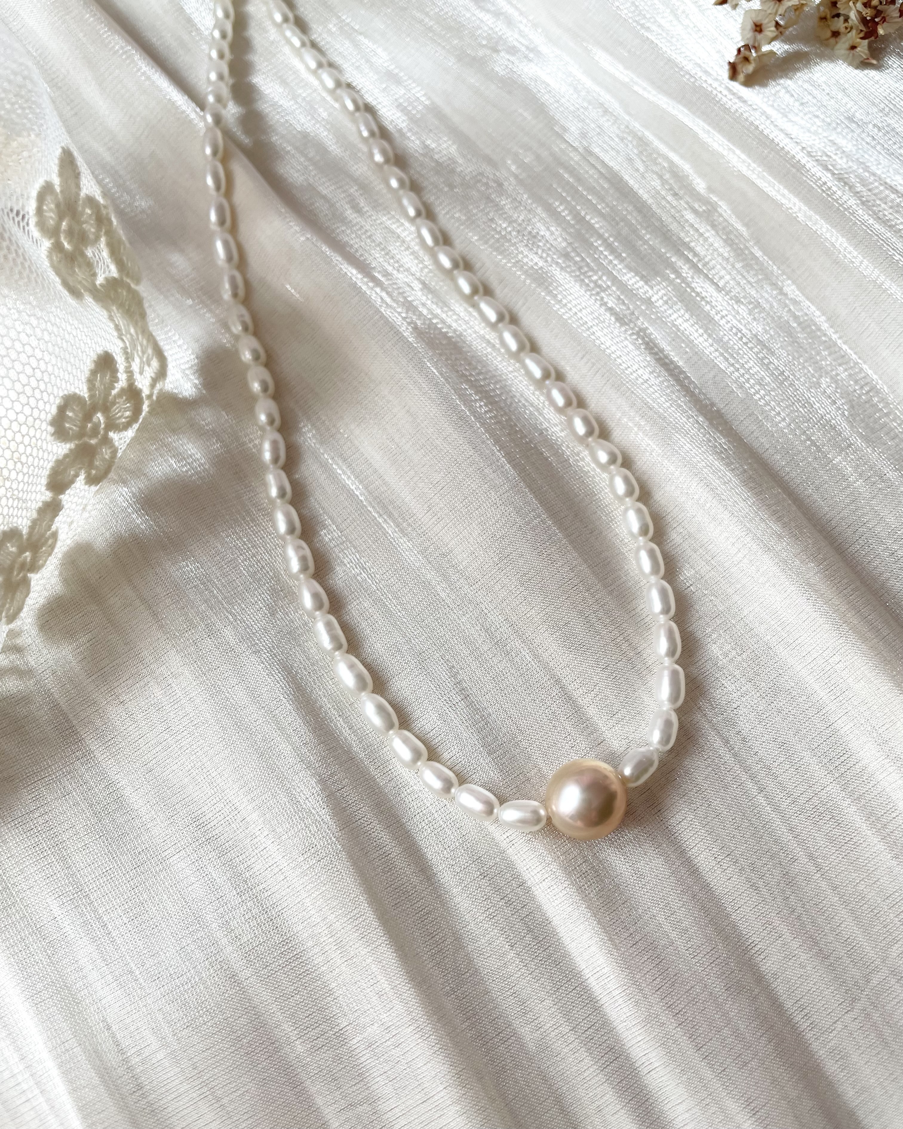 天然米形珍珠,搭配橘粉色的淡水圓珍珠,增添了幾分羞澀與優雅。