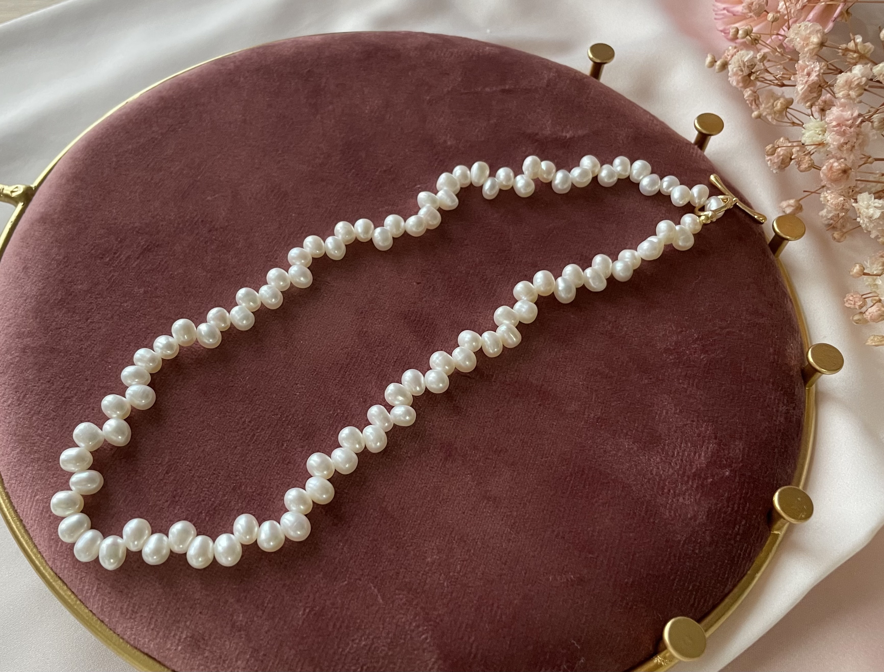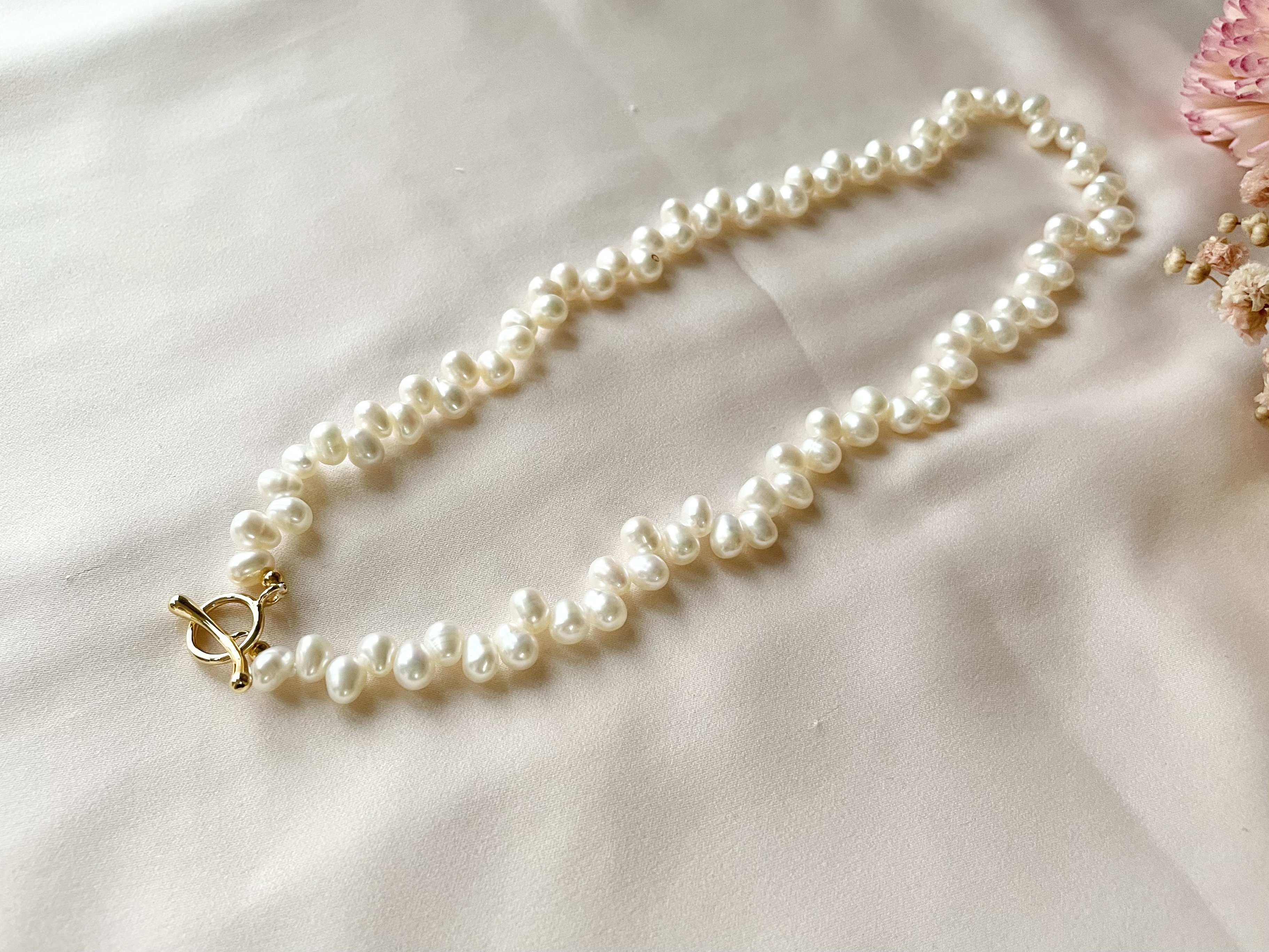 天然淡水米形珍珠/ 曲線OT釦位置可隨意變化在頸部。