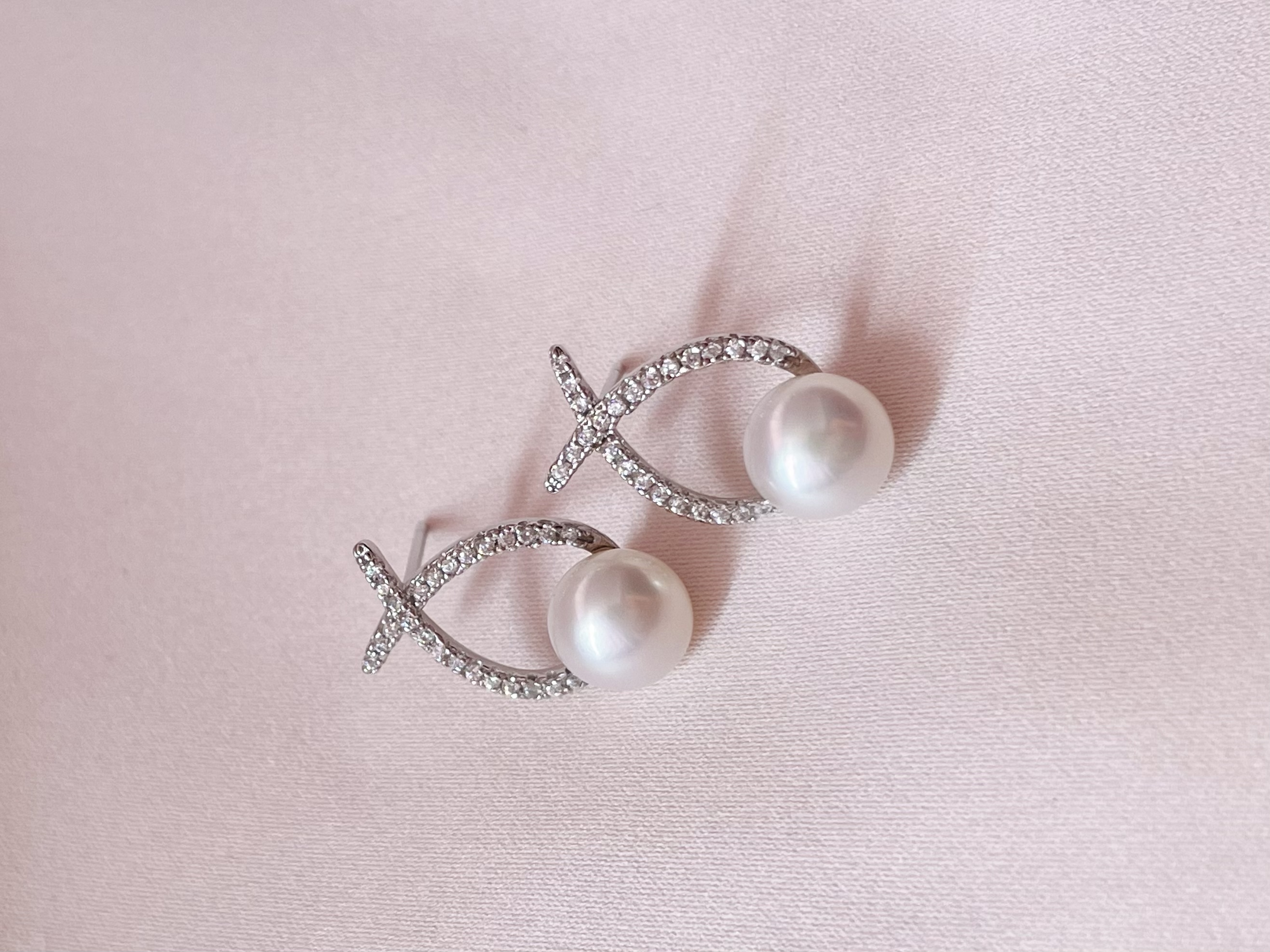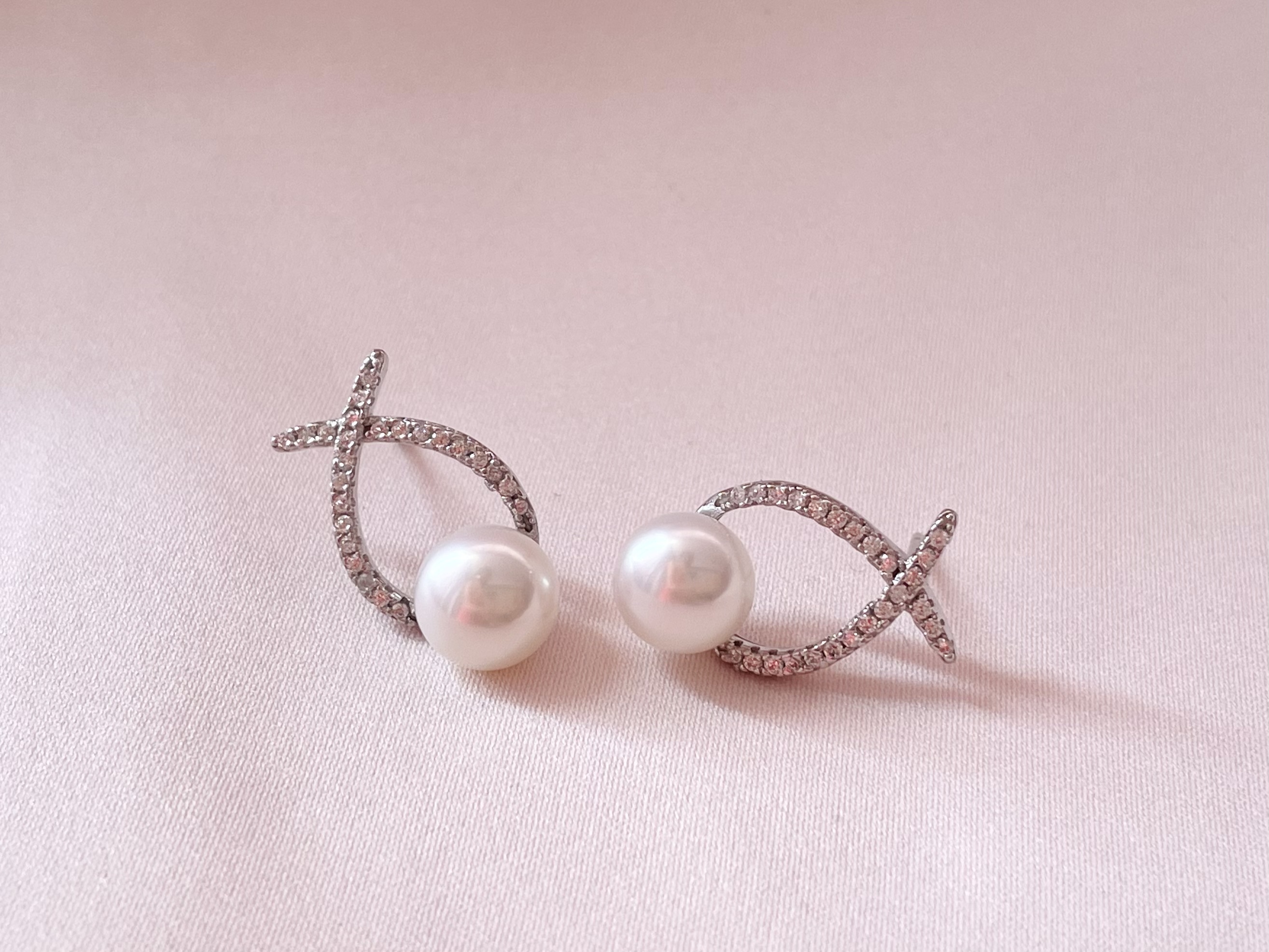魚兒造型的鋯石鑽交叉線條珍珠耳環,可活潑可愛又可氣質淑女。