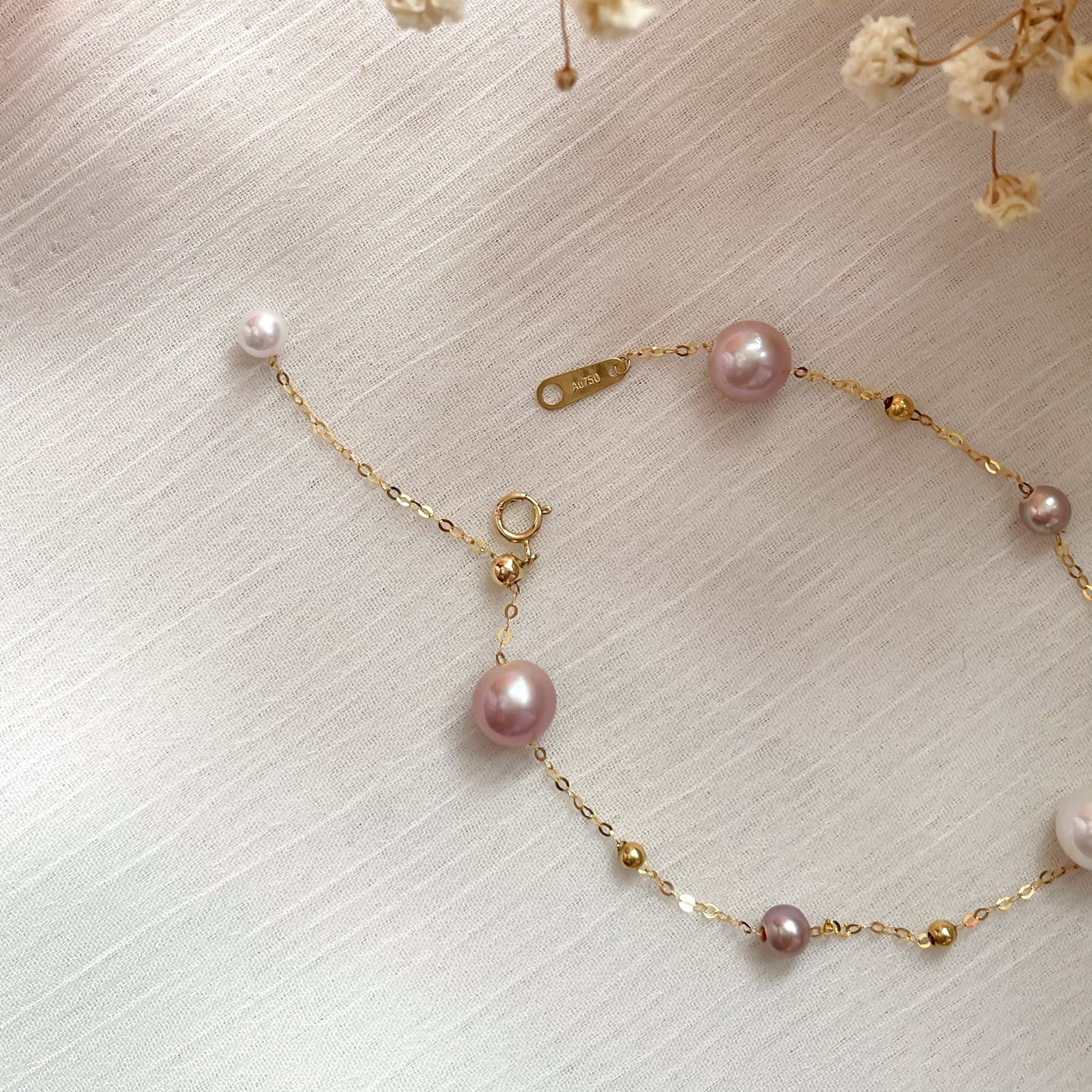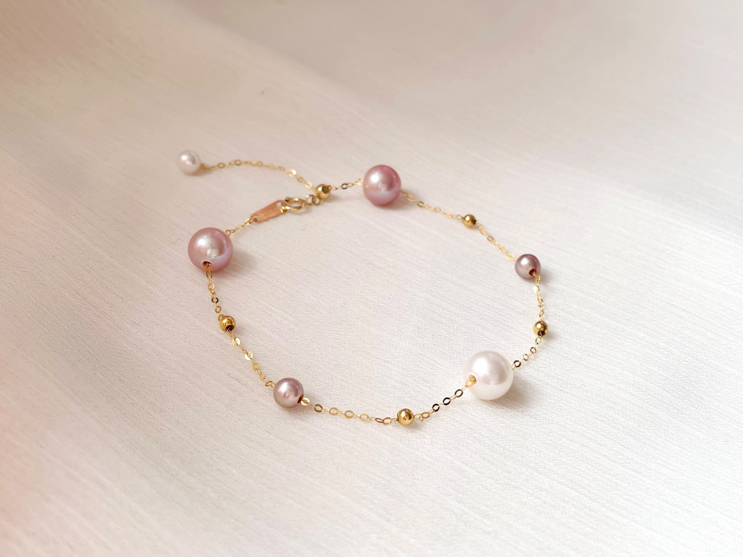 Elegant 堅持選用優質天然色珍珠,一顆白色搭配浪漫的粉紫色大小珍珠及18K小金珠的點綴,